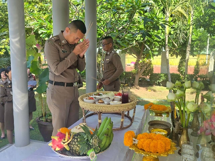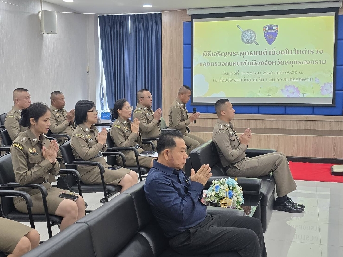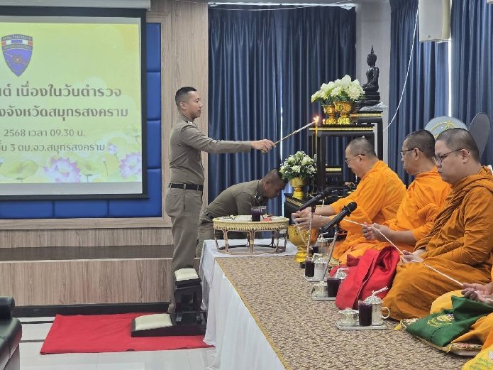 วันที่ 17 ต.ค.2568 เวลา 08.59 น. เป็นต้นไป พ.ต.ท.นัฐพล ชมศิริ สวญ.ตม.จว.สมุทรสงคราม บก.ตม.3 นำข้าราชการตำรวจในสังกัด ร่วมทำบุญอาคารที่ทำการฯ โดยเจริญพระพุทธมนต์ และถวายสังฆทานแด่พระสงฆ์ จำนวน 9 รูป เนื่องใน วันตำรวจ ประจำปี 2568 ณ อาคารที่ทำการ ตม.จว.สมุทรสงคราม