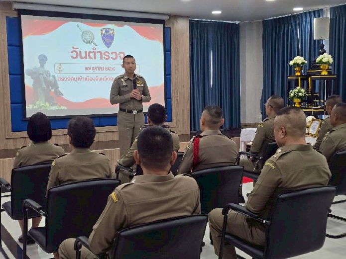 วันที่ 17 ต.ค.2568 เวลา 11.00 น. พ.ต.ท.นัฐพล ชมศิริ สวญ.ตม.จว.สมุทรสงคราม นำสารของ พล.ต.อ.กิตติ์รัฐ พันธุ์เพ็ชร์ ผู้บัญชาการตำรวจแห่งชาติ เนื่องใน วันตำรวจ 17 ตุลาคม 2568 มาประกาศให้ข้าราชการตำรวจในสังกัดทราบโดยทั่วกัน เพื่อตระหนักในบทบาทหน้าที่ของตน และสำนึกในความเป็น ตำรวจ ในการสร้างความมั่นคงปลอดภัยให้กับสังคมไทย และความเจริญรุ่งเรืองของประเทศชาติของเราต่อไป ณ ห้องประชุมแม่กลองชั้น 3 อาคารที่ทำการ ตม.จว.สมุทรสงคราม