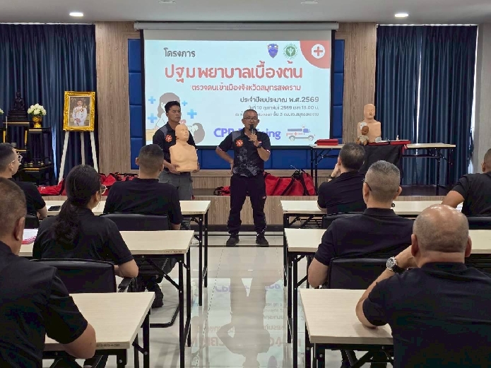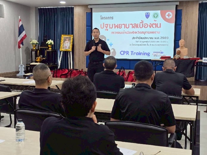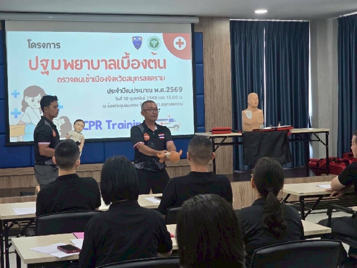 วันที่ 10 ก.พ.69 เวลา 13.00 - 15.00 พ.ต.ท.นัฐพล ชมศิริ สวญ.ตม.จว.สมุทรสงคราม ,พ.ต.ท.วินัย มีบุตรภักดี และ พ.ต.ต.พงศ์สรรค์ ทองใบ สว.ตม.จว.สมุทรสงคราม นำข้าราชการตำรวจและลูกจ้างในสังกัดเข้าร่วมอบรมโครงการปฐมพยาบาลเบื้องต้น (CPR Training)และการใช้เครื่อง AED เพื่อให้มีความรู้ในการปฐมพยาบาล หรือช่วยฟื้นคืนชีพขั้นพื้นฐานให้กับประชาชนทั้งชาวไทยและต่างชาติ ซึ่งอาจมีอาการหยุดหายใจหรือหัวใจหยุดเต้นให้กลับมาหายใจได้ โดยมีวิทยากรจากเทศบาลเมืองสมุทรสงครามมาเป็นครูผู้ฝึกสอน