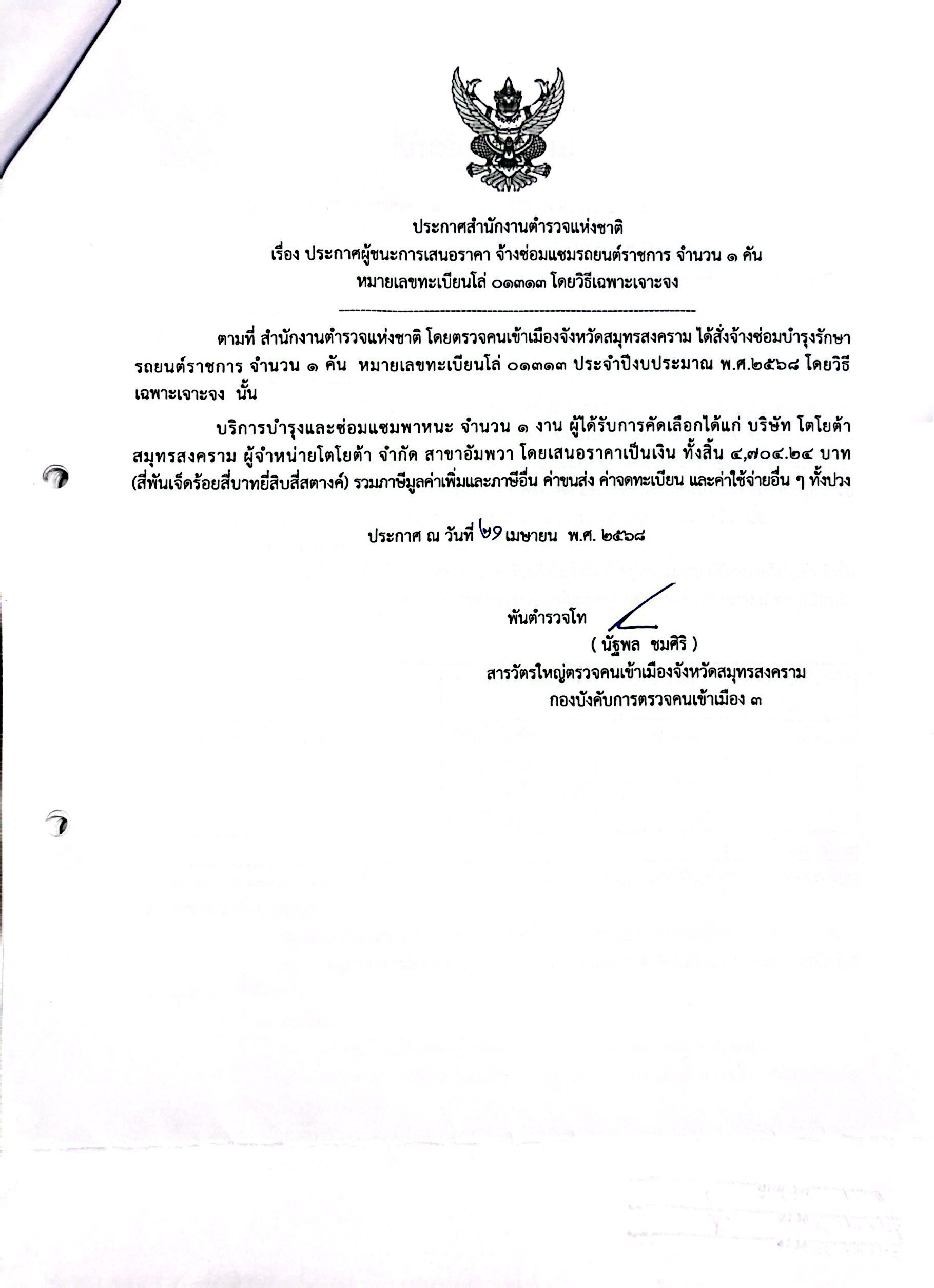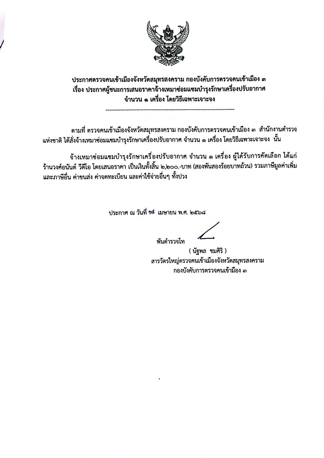 ประกาศผู้ชนะการเสนอราคา จ้างเหมาซ่อมแซมป้ายตราสัญลักษณ์สำนักงานตรวจคนเข้าเมือง พร้อมติดตั้ง ณ อาคารที่ทำการตรวจคนเข้าเมืองจังหวัดสมุทรสงคราม โดยวิธีเฉพาะเจาะจง
