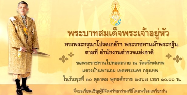 สำนักงานตำรวจแห่งชาติ ขอเชิญร่วมพิธีถวายผ้าพระกฐินพระราชทาน ประจำปีพุทธศักราช 2567 ณ วัดตรีทศเทพวรวิหาร